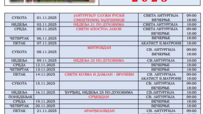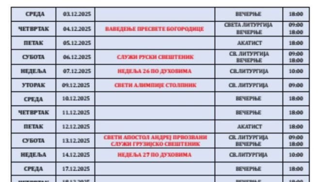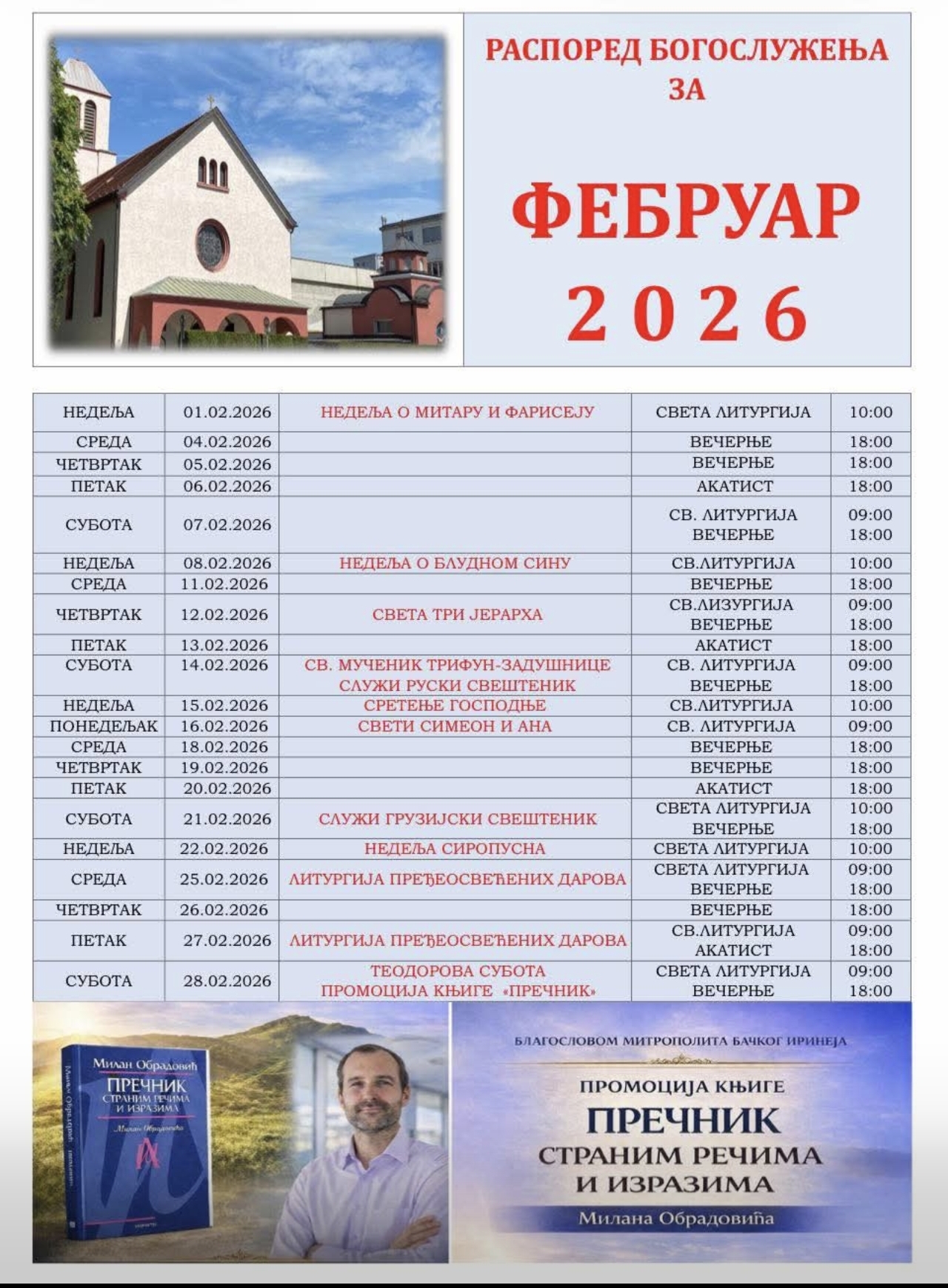 Вести Распоред Богослужења за Децембар 2025 2. децембар 2025 Распоред Богослужења за Новембар 2025 31. октобар 2025 Поклоничко путовање у Грузију 10. октобар 2025 15. Такмичење у кувању чорбанца 10. октобар 2025 Распоред Богослужења за Октобар 2025 1. октобар 2025 Распоред Богослужења за Септембар 2025 30. август 2025 Распоред Богослужења за Јул и Август 2025 3. јул 2025 ВИДОВДАН У МАУТХАУЗЕНУ 2025. – МОЛИТВА, СЕЋАЊЕ И САБОРНОСТ НА СВЕТОМ МЕСТУ – ВИДEO 30. јун 2025 ВИДОВДАН У МАУТХАУЗЕНУ 2025. – МОЛИТВА, СЕЋАЊЕ И САБОРНОСТ НА СВЕТОМ МЕСТУ 29. јун 2025 СПЦ ЛИНЦ ПОЗИВА 19. јун 2025