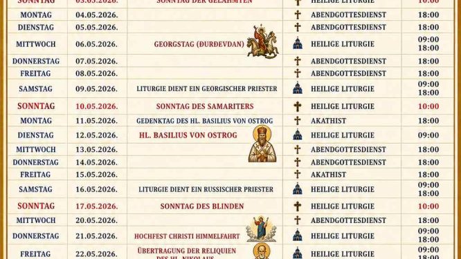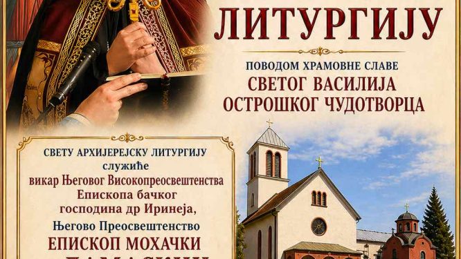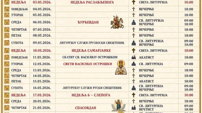 Вести Распоред Богослужења за Април 4. април 2026 Распоред Богослужења за Март 27. фебруар 2026 ПРАВОСЛАВАЦ 17. фебруар 2026 Промоција Књиге 9. фебруар 2026 Распоред Богослужења за Фебруар 9. фебруар 2026 Распоред Богослужења за Децембар 2025 2. децембар 2025 Распоред Богослужења за Новембар 2025 31. октобар 2025 Поклоничко путовање у Грузију 10. октобар 2025 15. Такмичење у кувању чорбанца 10. октобар 2025 Распоред Богослужења за Октобар 2025 1. октобар 2025