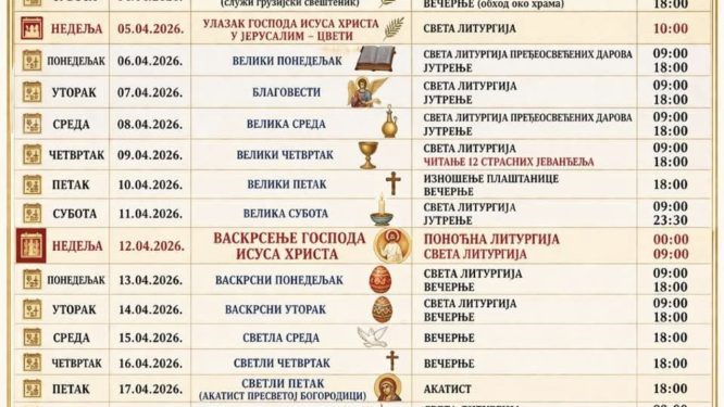 Вести Распоред Богослужења за Март 27. фебруар 2026 ПРАВОСЛАВАЦ 17. фебруар 2026 Промоција Књиге 9. фебруар 2026 Распоред Богослужења за Фебруар 9. фебруар 2026 Распоред Богослужења за Децембар 2025 2. децембар 2025 Распоред Богослужења за Новембар 2025 31. октобар 2025 Поклоничко путовање у Грузију 10. октобар 2025 15. Такмичење у кувању чорбанца 10. октобар 2025 Распоред Богослужења за Октобар 2025 1. октобар 2025 Распоред Богослужења за Септембар 2025 30. август 2025