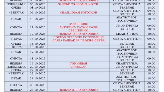 РАСПОРЕД БОГОСЛУЖЕЊА ЗА АПРИЛ 2025