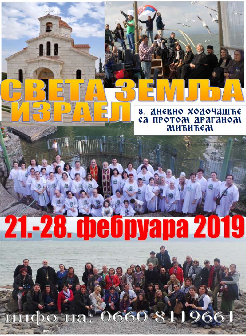 Ходочашће – Света Земља Израел 21.-28.02.2019. 13. јун 2018 Осмодневно ходочашће у Свету Земљу са протом Драганом Мићићем од 21. до 28. фебруара 2019. Информације на телефон: 0660 8119661 Ознаке See more Промоција књиге „Задужбине Косова и Метохије“ Сви чланци Ходочашће – Света Русија 25.05-01.06.2019.