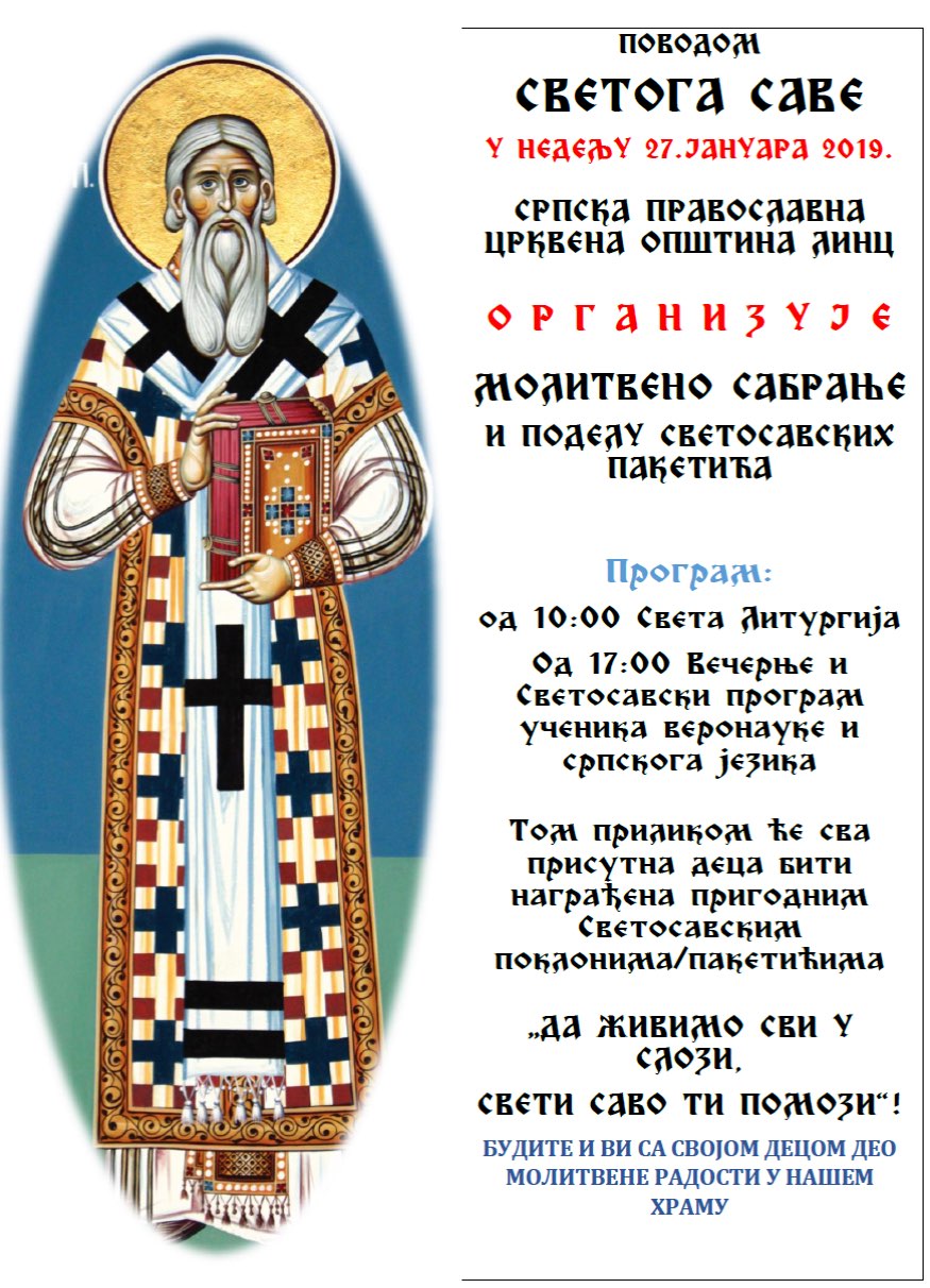 Молитвено сабрање поводом Светог Саве 23. јануар 2019 Ознаке See more Пливање за Часни Крст у Линцу Сви чланци Највећи српски просветитељ и учитељ Свети Сава, свечано је прослављен у црквеној општини у Линцу