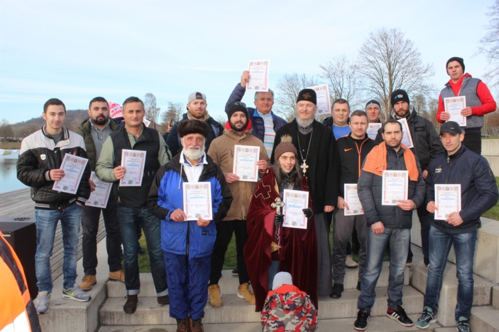 И на језеру је прота Драган освештао воду помоливши се за присутни народ а потом се шеснаест пливача појавило на старту, предвођени амбасадором Србије г. Небојшом Родићем. После интонирања химне „Боже правде“, прота је дао знак за почетак пливања,(“ЗА КРСТ ЧАСНИ,КРЕНИ!“).