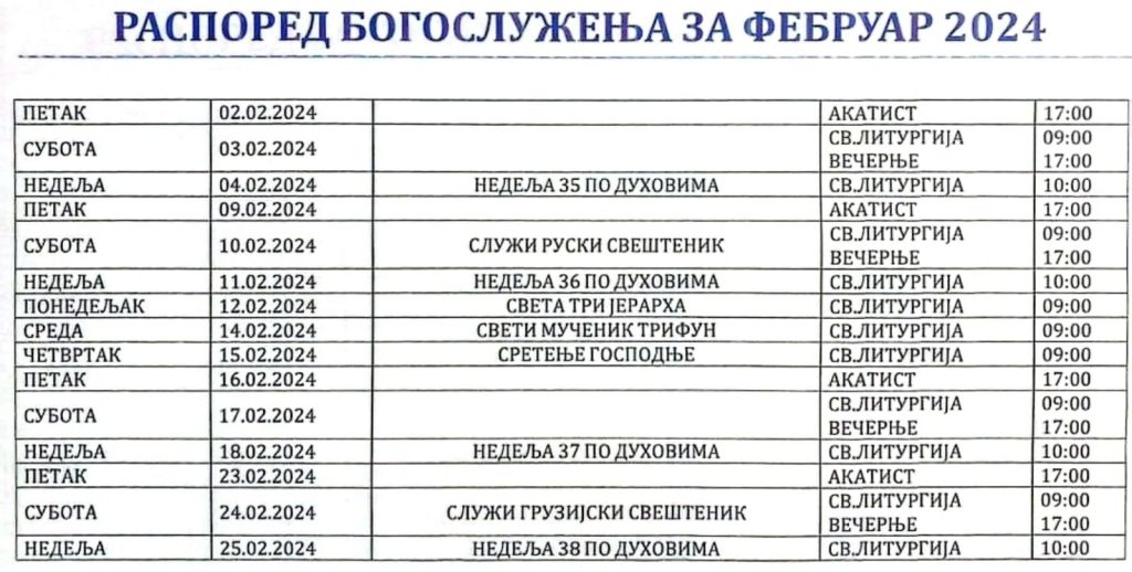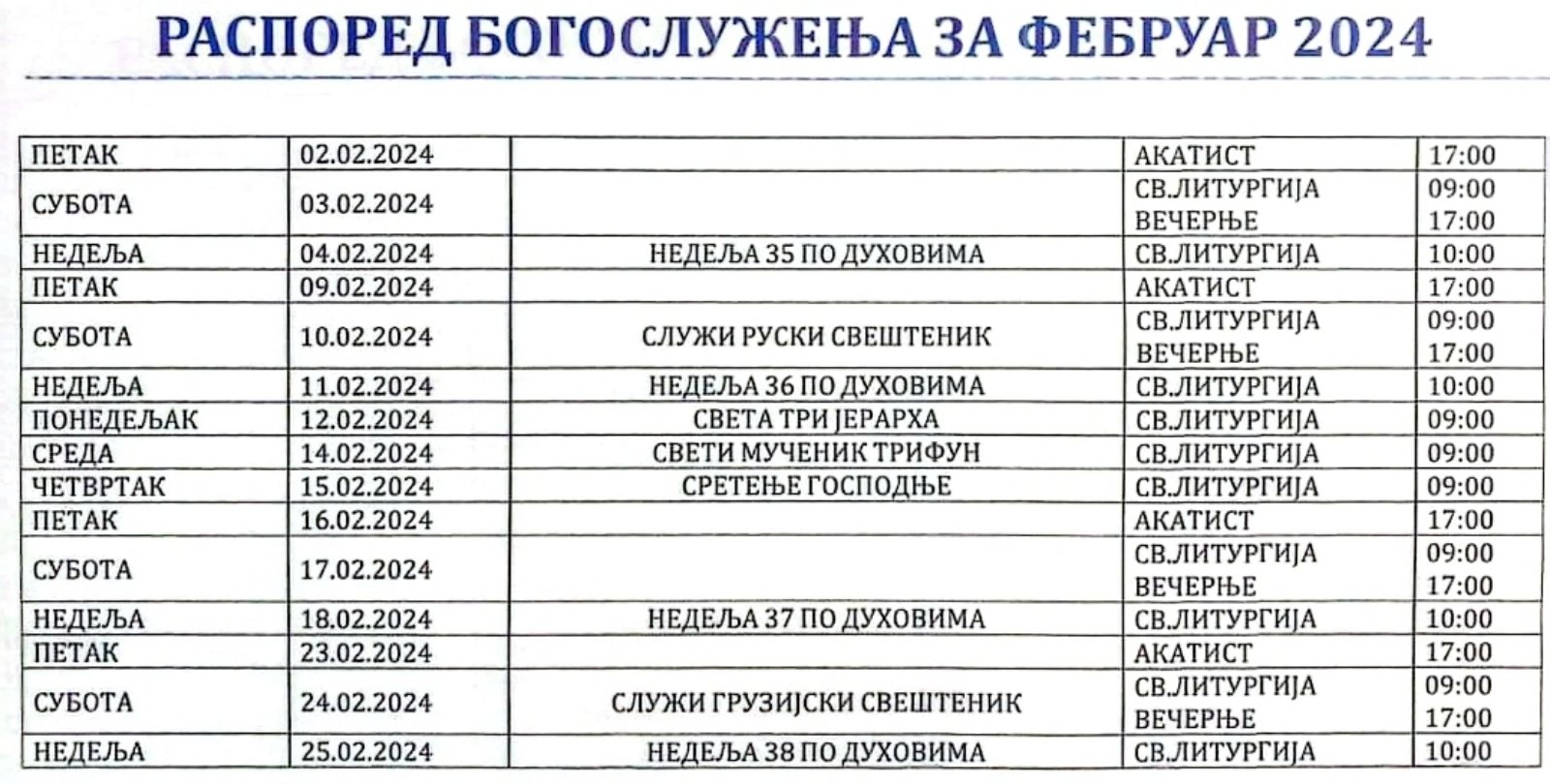 Распоред Богослужења за Фебруар 2024 1. фебруар 2024 Ознаке See more Христос се роди! Сви чланци Распоред Богослужења за Март 2024