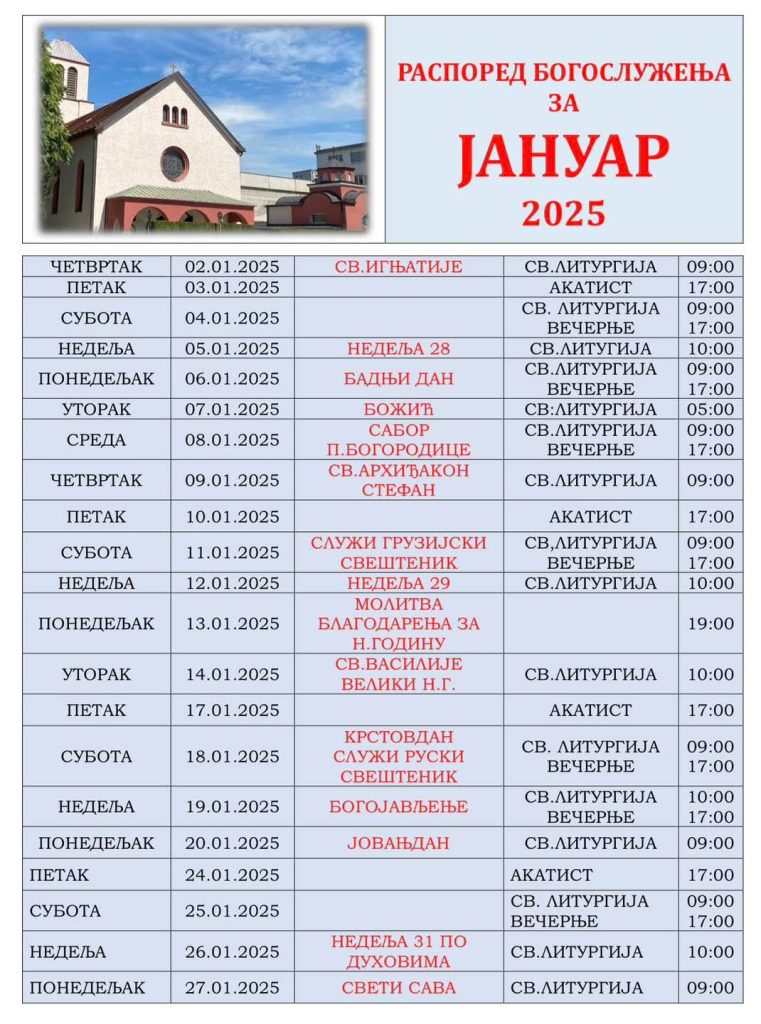 РАСПОРЕД БОГОСЛУЖЕЊА ЗА ЈАНУАР 2025 30. децембар 2024 Ознаке See more СПЦ ОПШТИНА ЛИНЦ ОРГАНИЗУЈЕ Сви чланци СПЦ ОПШТИНА ЛИНЦ ОРГАНИЗУЈЕ