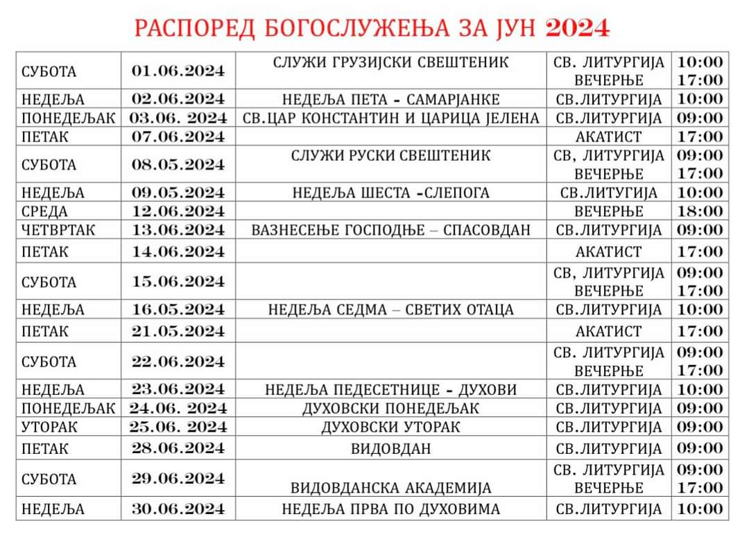 Распоред Богослужења за Јун 2024 27. мај 2024 Ознаке See more Прослава Светог Василија Острошког Чудотворца, парохијска слава СПЦ у Линцу Сви чланци Распоред Богослужења за Јули 2024