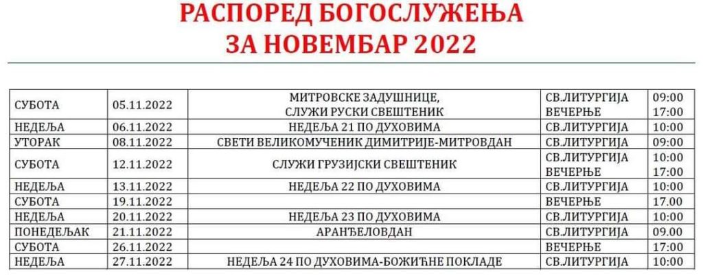 Распоред Богослужења за Новембар 2022 30. октобар 2022 Ознаке See more Распоред Богослужења за Септембар и Октобар 2022 Сви чланци Распоред Богослужења за Децембар 2022